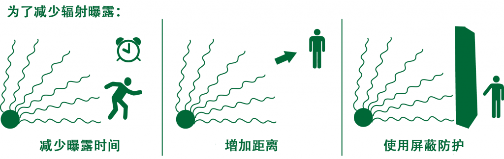 时间,距离和屏蔽可使你接触到辐射减至最少,如同它们可保护你不会被太阳过份曝晒一样:
